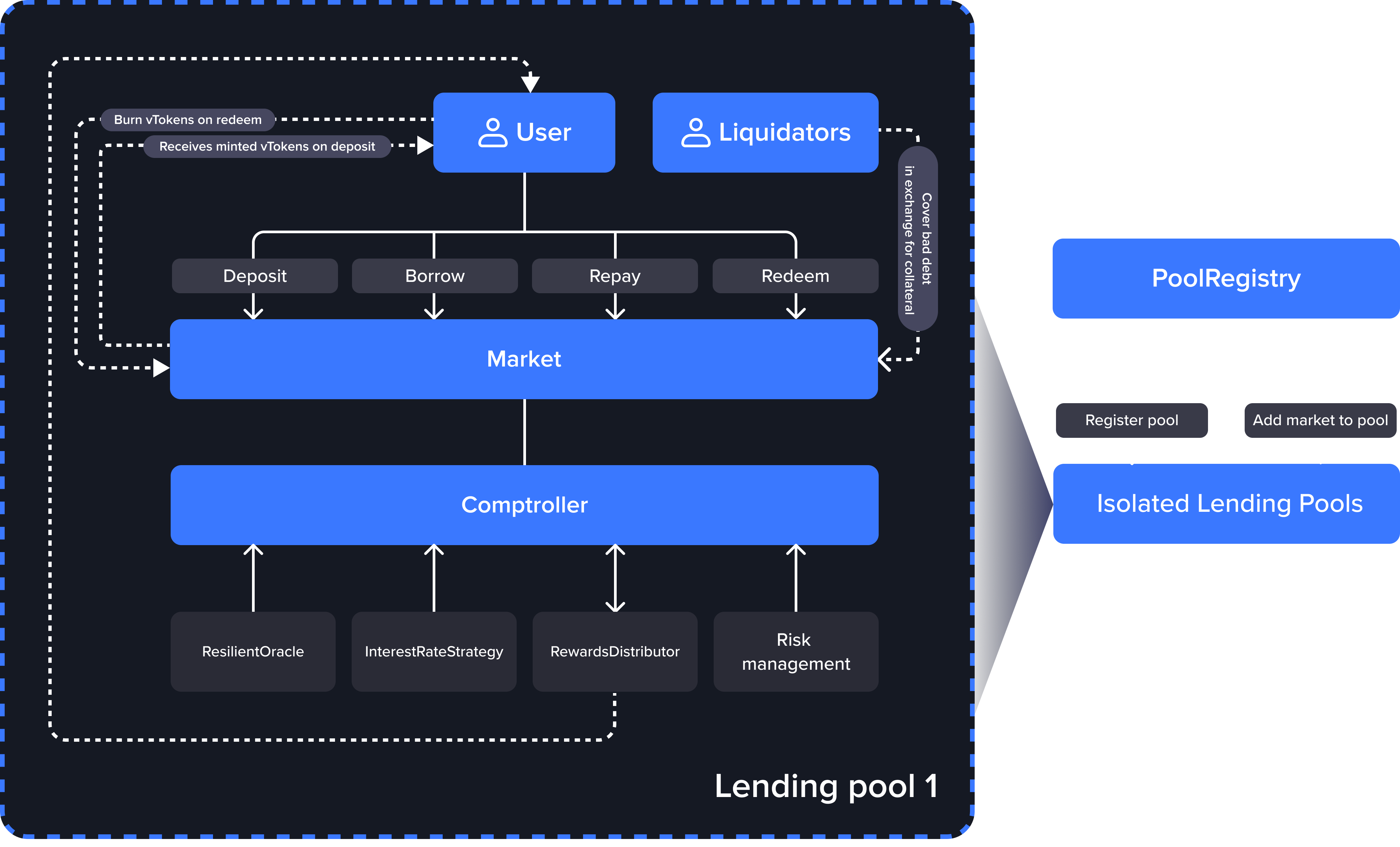 To add a new market to an existing lending pool, the PoolRegistry deploys a JumpRateModelV2 or a WhitePaperInterestRateModel contract, deploying the upgradable VToken for the market before gaining the approval of the market's Comptroller.